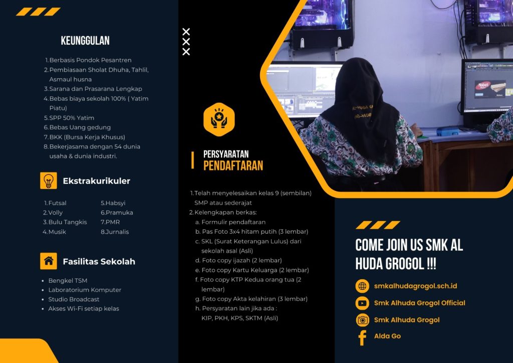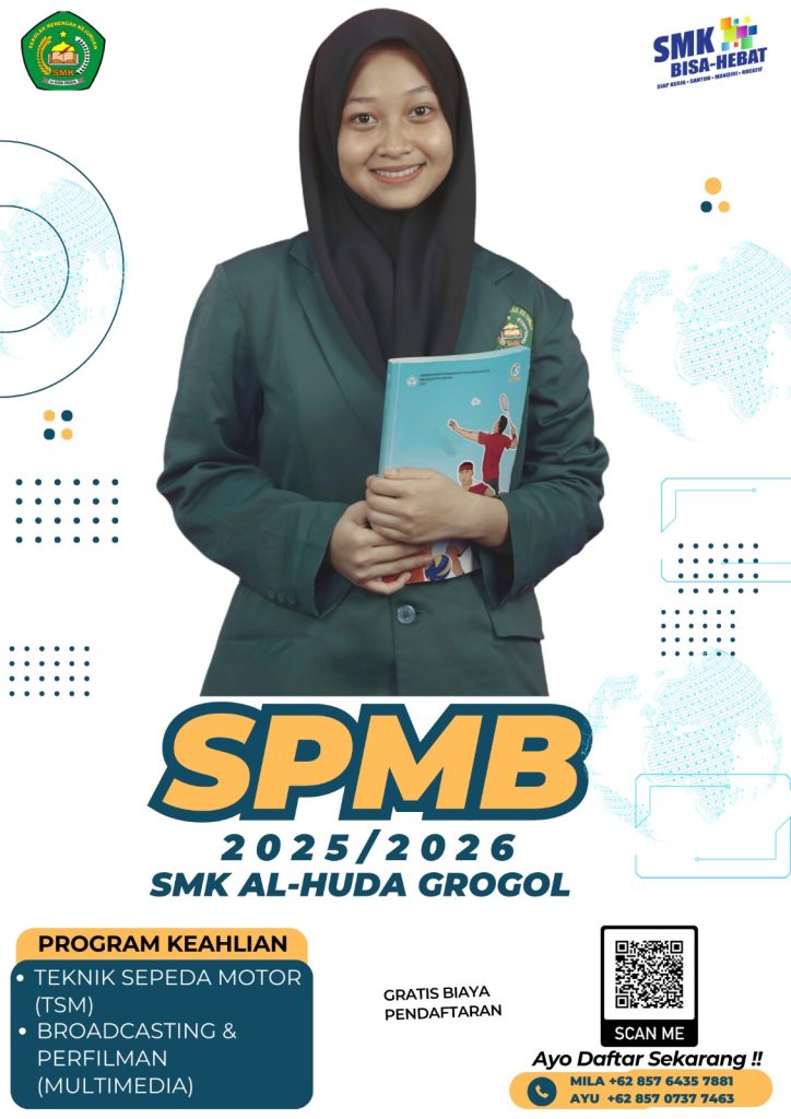 Sistem Penerimaan Murid Baru SMK AL-HUDA GROGOL dimulai dari tanggal 10 Februari sampai dengan 17 Juli 2025. Informasi lebih lengkap hubungi 0857-6435-7882 (GB Mila) Dan 0857-8454-1239 (GB Nawa).